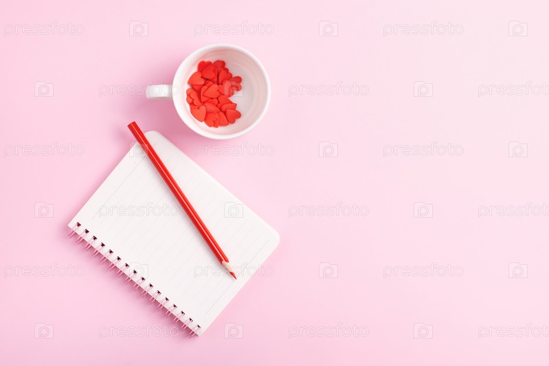 День святого валентина фон с копией пространства. Белая страница, красный карандаш и декоративные сердечки на розовом фоне