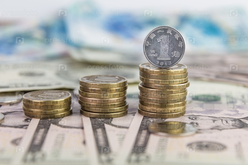 Монета в один юань стоит на стопке монет