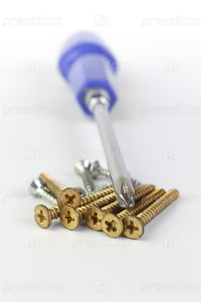 Крестовая отвертка и желтые винты на белом фоне с малой глубиной резкости