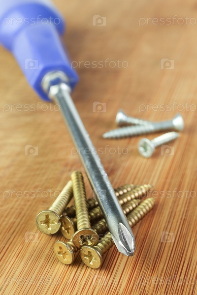 Крестообразная отвертка и винты крупным планом на деревянной поверхности с малой глубиной резкости
