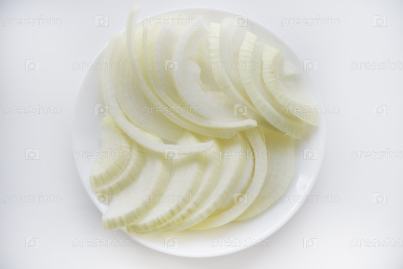Нарезанный лук на белой тарелке. Свежий лук. Овощи крупным планом