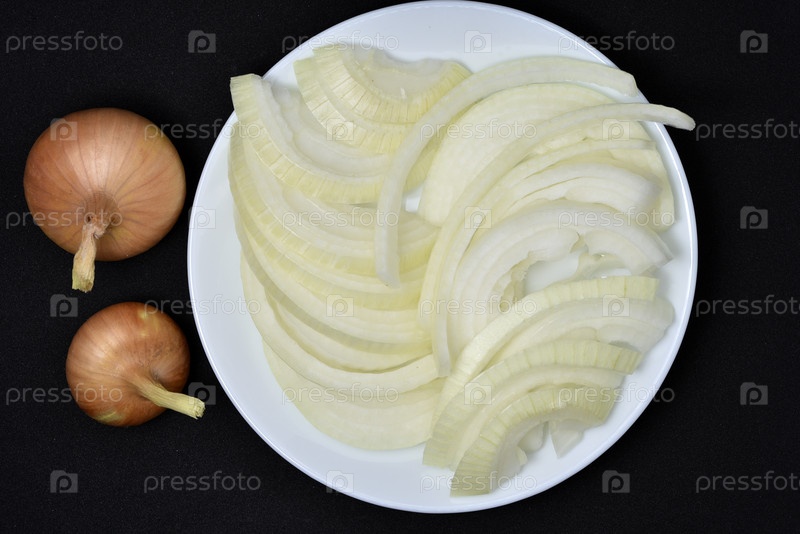Две лампочки на черном фоне. Овощи крупным планом. Свежий нарезанный лук