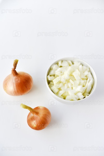 Два лука и нарезанный лук на белой тарелке. Лук на белом фоне