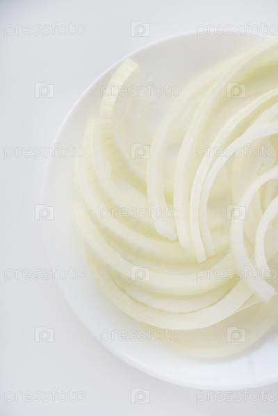 Нарезанный лук на белой тарелке. Свежий лук. Овощи крупным планом