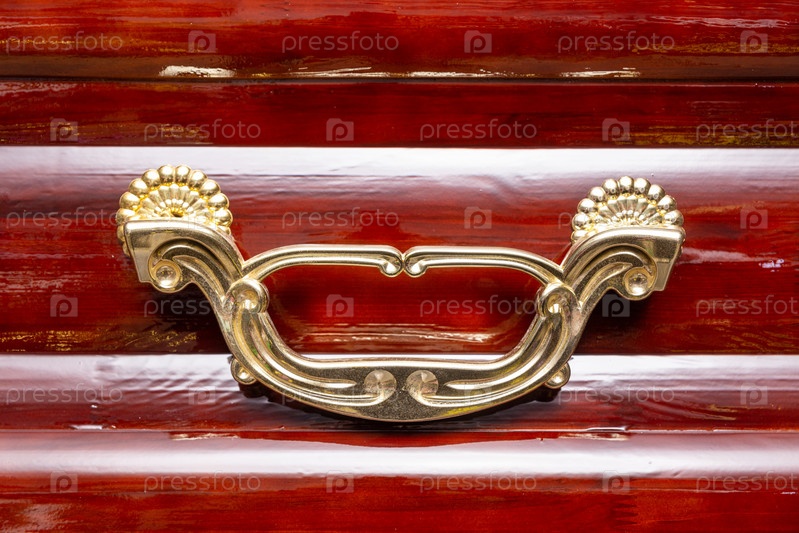 Крупный план похоронной шкатулки или гроба в специализированном магазине. Гроб изготовлен из красного дерева с фурнитурой из желтого металла