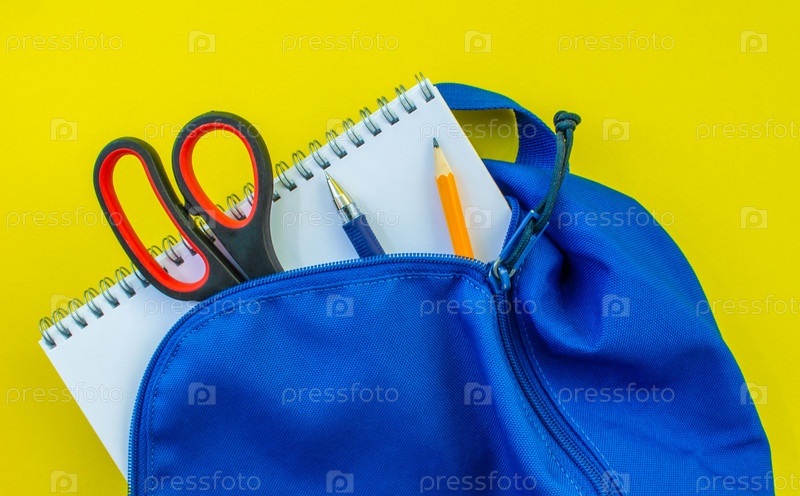 Школьный рюкзак, карандаш, ручка, ножницы и блокнот на желтом фоне