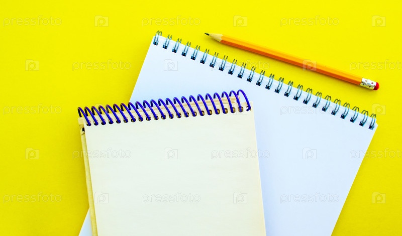 Белые и бежевые блокноты и карандаш на желтом фоне