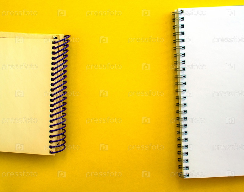 Белые и бежевые блокноты на желтом фоне, пустое место в центре