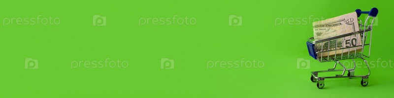 Баннер. Корзина с 50-долларовыми купюрами на зеленом фоне