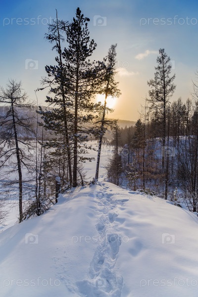 Зимний пейзаж со следами на снегу