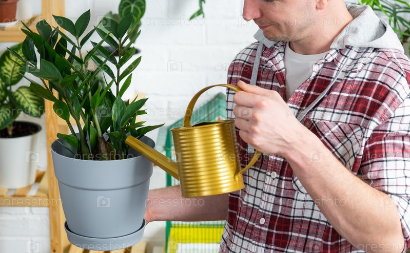 Мужчина поливает домашние растения из своей коллекции редких видов из лейки, с любовью выращенной на полках в интерьере дома. Домашнее растениеводство, теплица, водный баланс