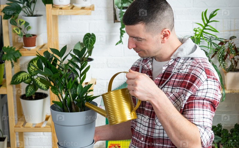 Мужчина поливает домашние растения из своей коллекции редких видов из лейки, с любовью выращенной на полках в интерьере дома. Домашнее растениеводство, теплица, водный баланс