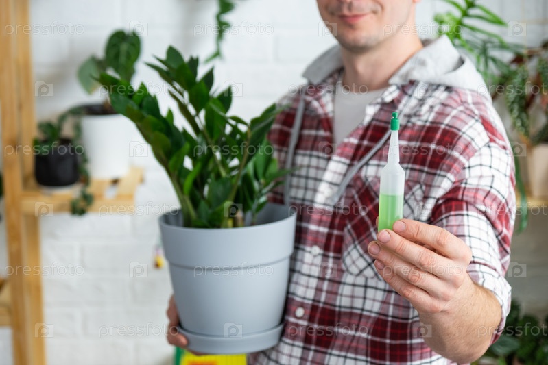 Капельное удобрение для горшечных растений замиокулькас, стимулятор развития, ускорение роста, уход за домашними растениями. Бутылка жидкости вставлена в руку человека. Домашнее растениеводство