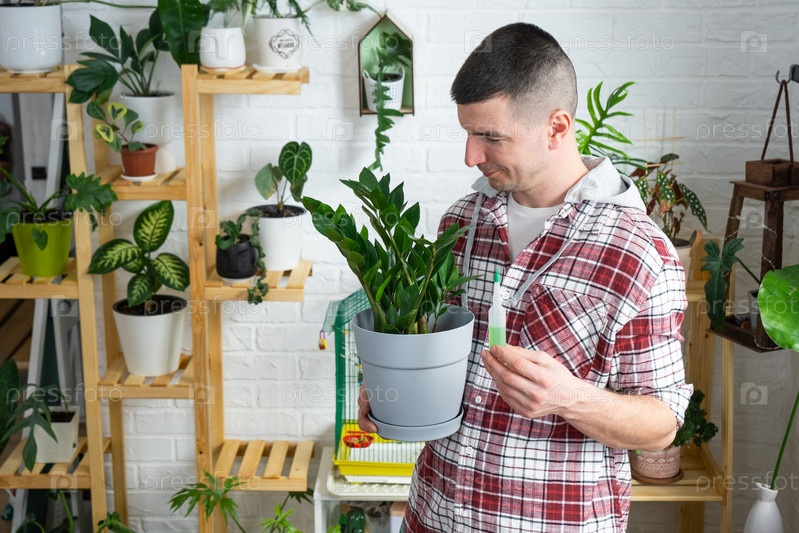 Капельное удобрение для горшечных растений замиокулькас, стимулятор развития, ускорение роста, уход за домашними растениями. Бутылка жидкости вставлена в руку человека. Домашнее растениеводство