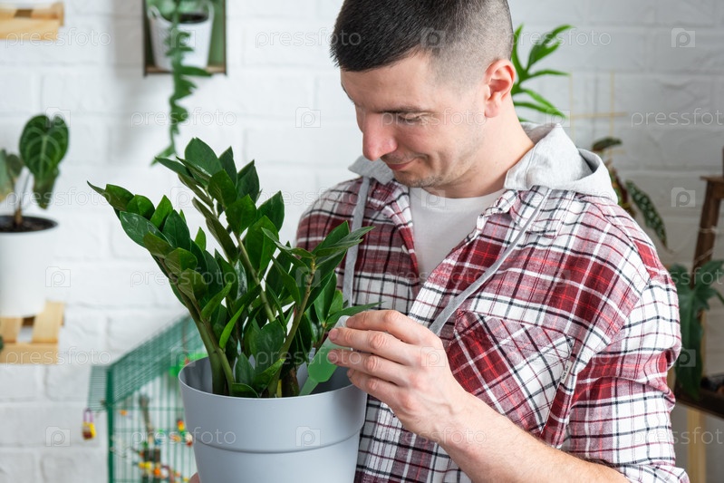 Капельное удобрение для горшечных растений замиокулькас, стимулятор развития, ускорение роста, уход за домашними растениями. Бутылка жидкости вставлена в руку человека. Домашнее растениеводство