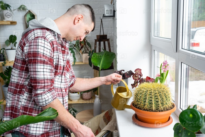 Мужчина льет из лейки в поддон Большой эхинокактус Грузони на подоконнике домашних растений. Домашнее растениеводство, Водный баланс пустынных растений