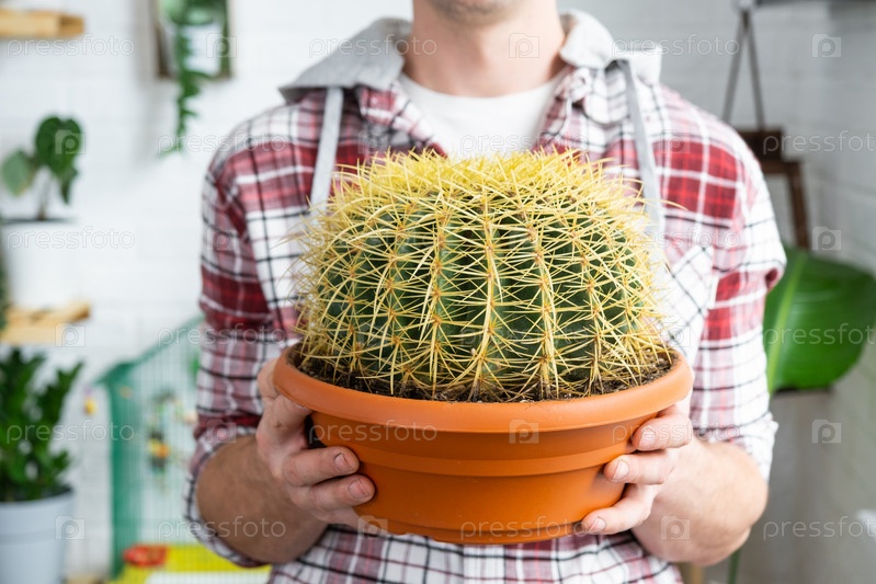 Большой эхинокактус Грузони в руках человека в интерьере возле окна на подоконнике домашних растений. Домашнее растениеводство, селекционер любуется кактусом в горшке