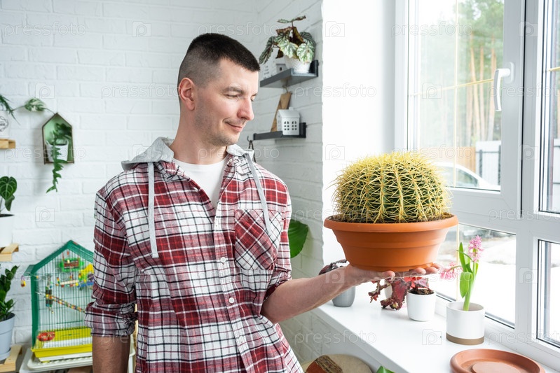 Большой эхинокактус Грузони в руках человека в интерьере возле окна на подоконнике домашних растений. Домашнее растениеводство, селекционер любуется кактусом в горшке