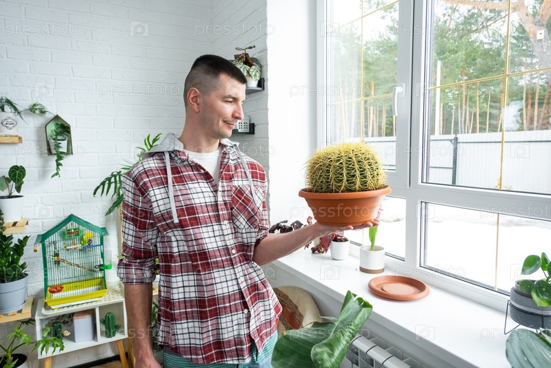 Большой эхинокактус Грузони в руках человека в интерьере возле окна на подоконнике домашних растений. Домашнее растениеводство, селекционер любуется кактусом в горшке
