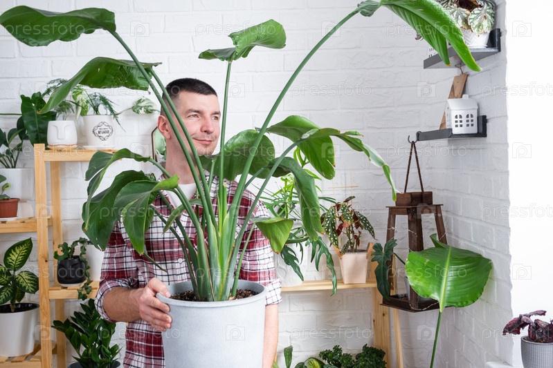 Мужчина-заводчик держит в руках домашние растения Стрелиция в горшке из ее коллекции дома на полках. Поиск вредителей, уход, полив, удобрения. Домашнее растениеводство