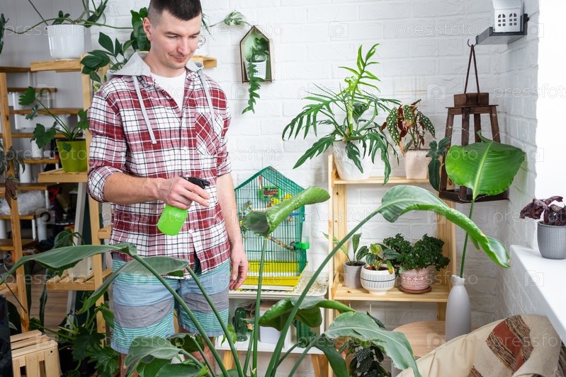 Мужчина опрыскивает из пульверизатора домашние растения из своей коллекции, выращенные с любовью на полках в интерьере дома. Домашнее растениеводство, теплица, водный баланс, увлажнение