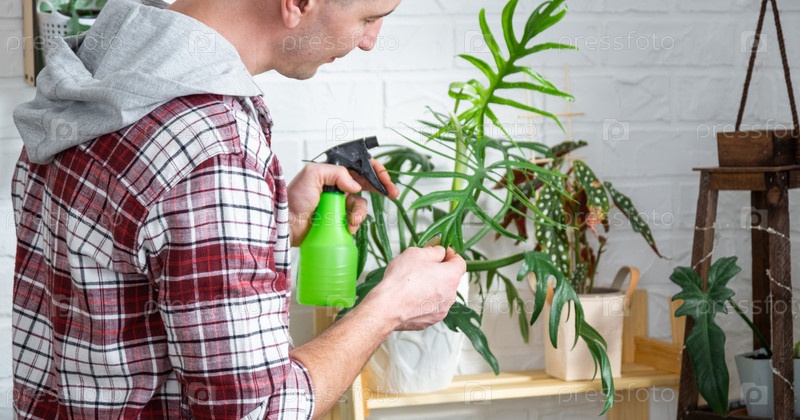 Мужчина-селекционер осматривает и любуется домашними растениями в горшке, ищет вредителей, ухаживает, поливает, удобряет, лечит от вредителей. Домашнее растениеводство