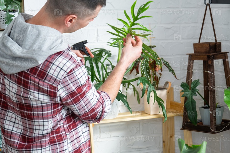 Мужчина-селекционер осматривает и любуется домашними растениями в горшке, ищет вредителей, ухаживает, поливает, удобряет, лечит от вредителей. Домашнее растениеводство