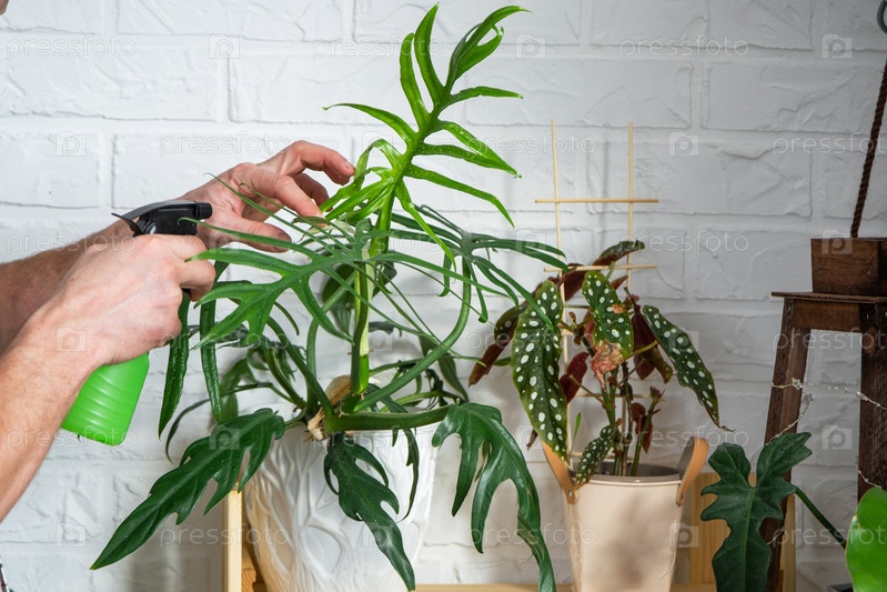 Мужчина-селекционер осматривает и любуется домашними растениями в горшке, ищет вредителей, ухаживает, поливает, удобряет, лечит от вредителей. Домашнее растениеводство
