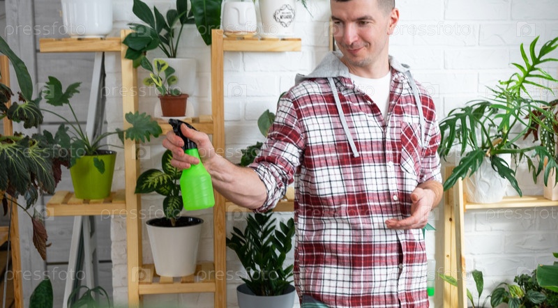 Мужчина опрыскивает из пульверизатора домашние растения из своей коллекции, выращенные с любовью на полках в интерьере дома. Домашнее растениеводство, теплица, водный баланс, увлажнение