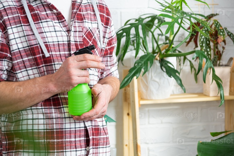 Мужчина опрыскивает из пульверизатора домашние растения из своей коллекции, выращенные с любовью на полках в интерьере дома. Домашнее растениеводство, теплица, водный баланс, увлажнение
