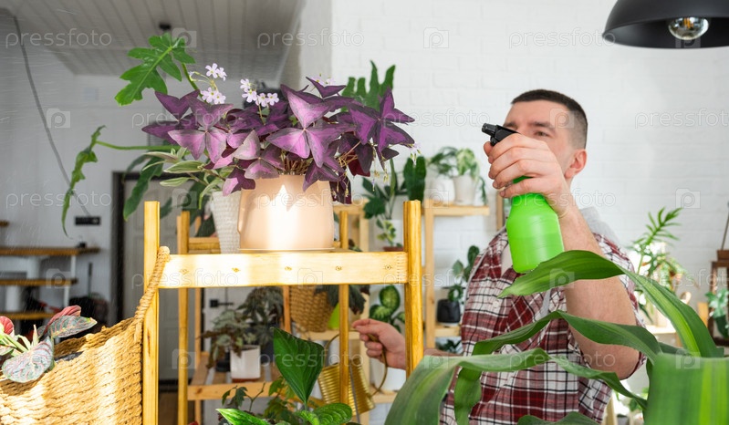 Мужчина опрыскивает из пульверизатора домашние растения из своей коллекции, выращенные с любовью на полках в интерьере дома. Домашнее растениеводство, теплица, водный баланс, увлажнение