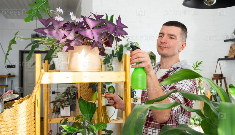 Мужчина опрыскивает из пульверизатора домашние растения из своей коллекции, выращенные с любовью на полках в интерьере дома. Домашнее растениеводство, теплица, водный баланс, увлажнение