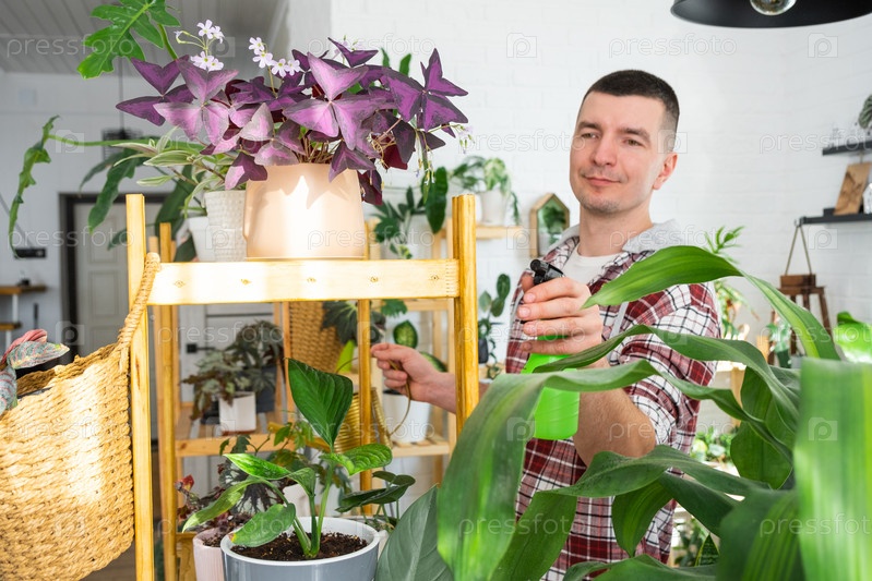 Мужчина опрыскивает из пульверизатора домашние растения из своей коллекции, выращенные с любовью на полках в интерьере дома. Домашнее растениеводство, теплица, водный баланс, увлажнение