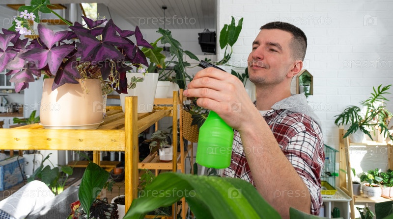 Мужчина опрыскивает из пульверизатора домашние растения из своей коллекции, выращенные с любовью на полках в интерьере дома. Домашнее растениеводство, теплица, водный баланс, увлажнение