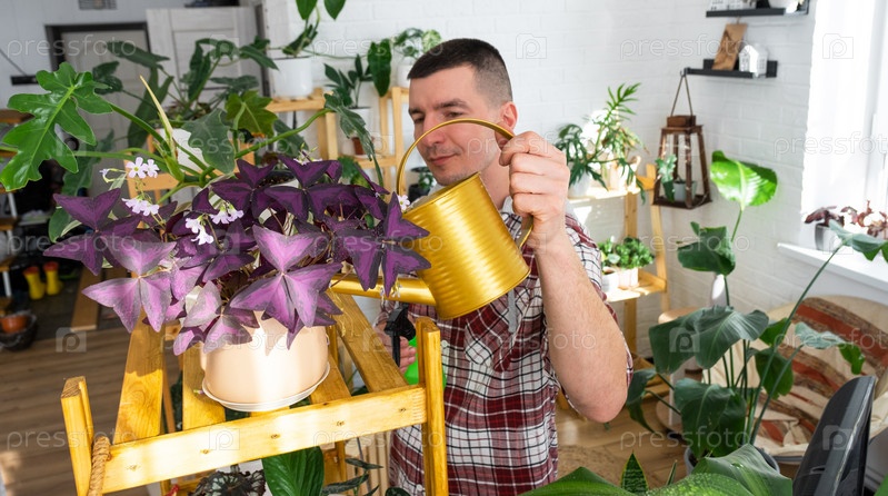 Мужчина поливает домашние растения из своей коллекции редких видов из лейки, с любовью выращенной на полках в интерьере дома. Домашнее растениеводство, теплица, водный баланс