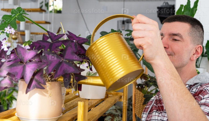 Мужчина поливает домашние растения из своей коллекции редких видов из лейки, с любовью выращенной на полках в интерьере дома. Домашнее растениеводство, теплица, водный баланс