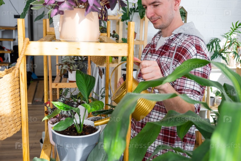 Мужчина поливает домашние растения из своей коллекции редких видов из лейки, с любовью выращенной на полках в интерьере дома. Домашнее растениеводство, теплица, водный баланс