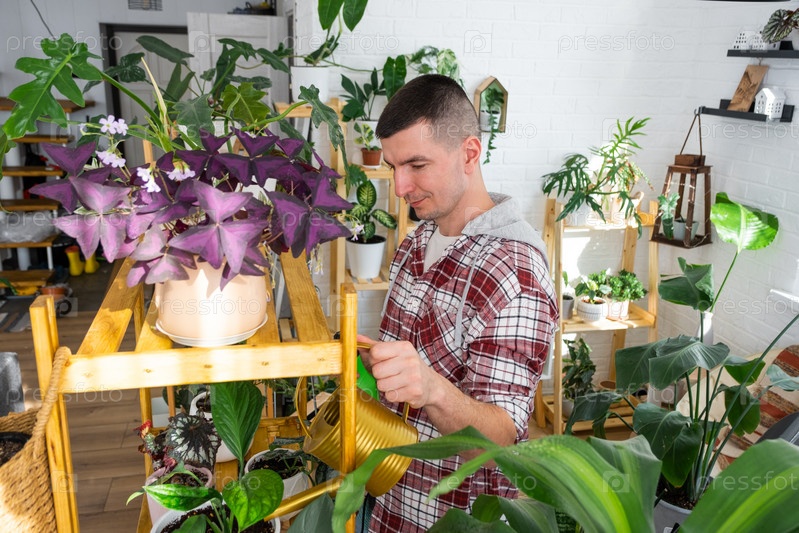 Мужчина поливает домашние растения из своей коллекции редких видов из лейки, с любовью выращенной на полках в интерьере дома. Домашнее растениеводство, теплица, водный баланс