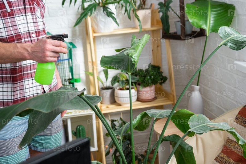 Мужчина опрыскивает из пульверизатора домашние растения из своей коллекции, выращенные с любовью на полках в интерьере дома. Домашнее растениеводство, теплица, водный баланс, увлажнение
