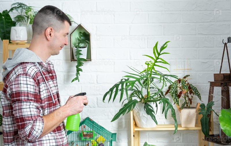 Мужчина опрыскивает из пульверизатора домашние растения из своей коллекции, выращенные с любовью на полках в интерьере дома. Домашнее растениеводство, теплица, водный баланс, увлажнение