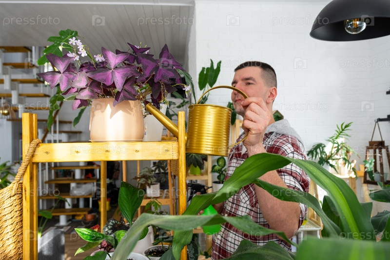Мужчина поливает домашние растения из своей коллекции редких видов из лейки, с любовью выращенной на полках в интерьере дома. Домашнее растениеводство, теплица, водный баланс