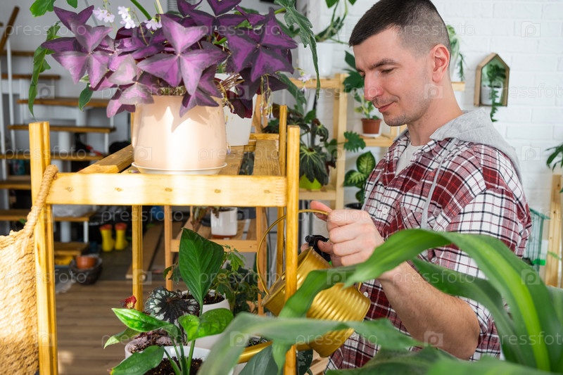 Мужчина поливает домашние растения из своей коллекции редких видов из лейки, с любовью выращенной на полках в интерьере дома. Домашнее растениеводство, теплица, водный баланс