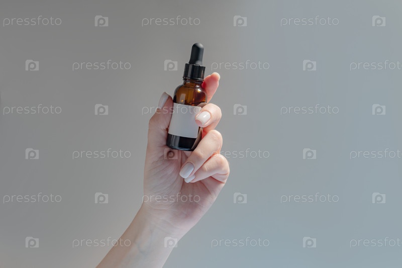 Женская рука с капельницей эфирного масла, ароматерапевтической эссенцией, косметической сывороткой с коллагеном или лекарственной жидкостью на бежевом фоне. Небрендовые бутылки для вашего дизайна