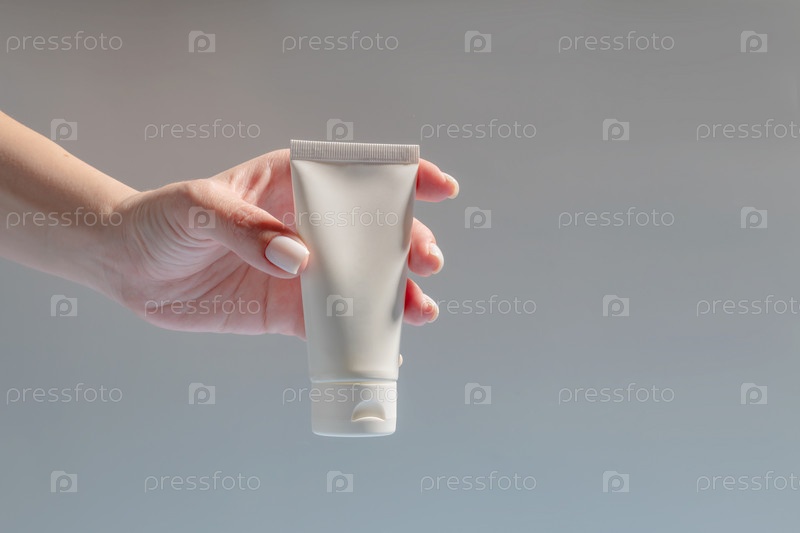 Косметика по уходу за кожей в белой пластиковой тубе на бежевом фоне. Женская рука держит тюбик со сливками. Презентация упаковки, макет