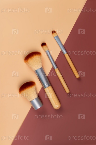 Набор кистей для макияжа с бамбуковыми ручками. Коллекция профессиональных кистей, выстроенная в красивую линию. Инструменты для натурального макияжа
