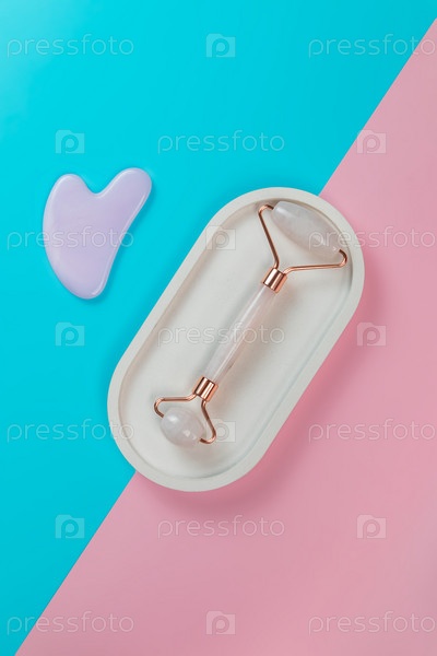 Ролик дерма массаж лица нефрит и камень гуа ша на подносе из белого мрамора на голубом и розовом фоне. косметика антивозрастные инструменты для дома повседневная жизнь