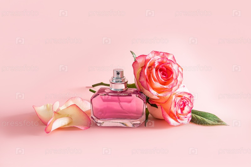 Хрустальная бутылка с женским парфюмом или спреем на розовом фоне с лепестками роз и цветами. Презентация аромата. Макет пустой бутылки