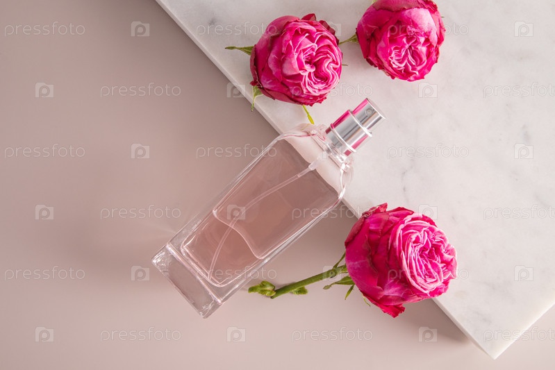 Прозрачная бутылка духов или косметический спрей с тремя красивыми розами лежит на подиуме из белого мрамора. Макет пустой бутылки. Реклама продукта