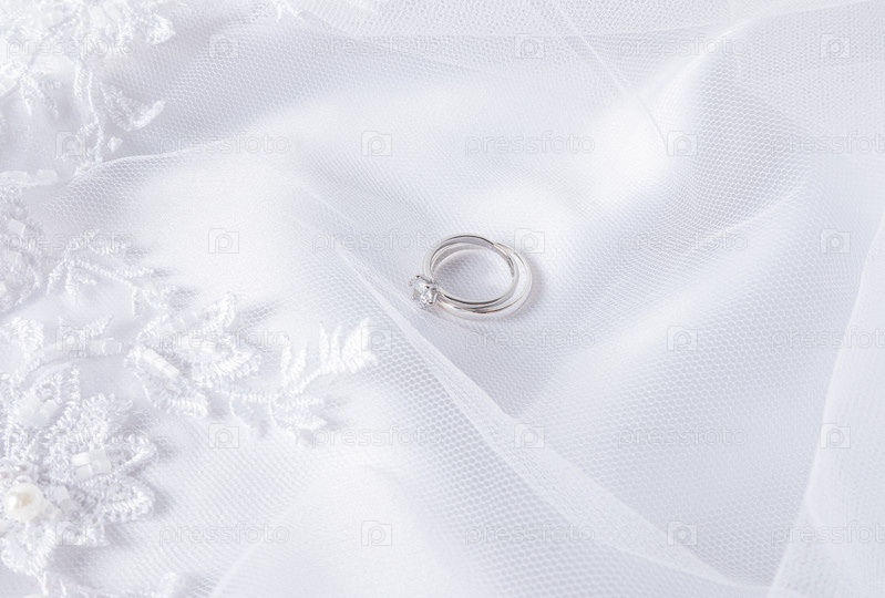 Два обручальных кольца из белого золота с бриллиантом лежат на белой фате с мягкими складками. Свадебный фон. макет для дизайна. открытка. приглашение