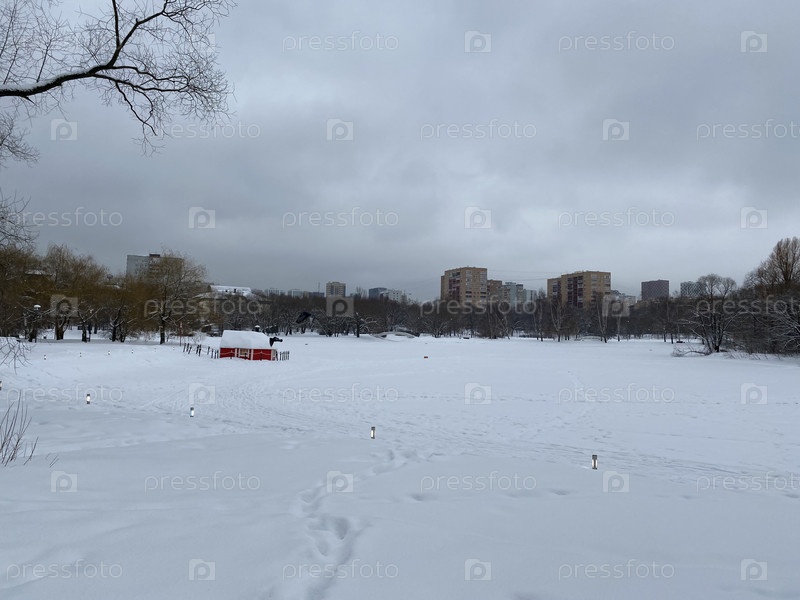 Зима в городском парке в сухой солнечный вечер